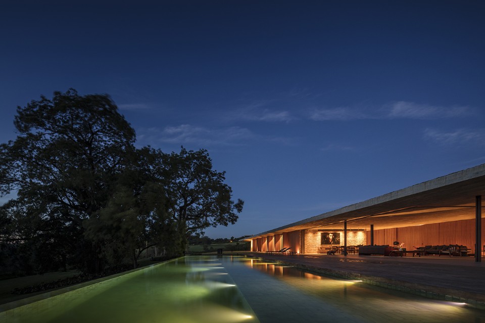Marcio Kogan’s studio is not an outsider as for the fundamental experiments on horizontality and this private residence at Porto Feliz, in San Paolo region, is not an exception. However, Casa Plana shows an uncommon element for this studio practice: a bendy curve, that is a wall of perforated bricks which moves freely in front of the east view.