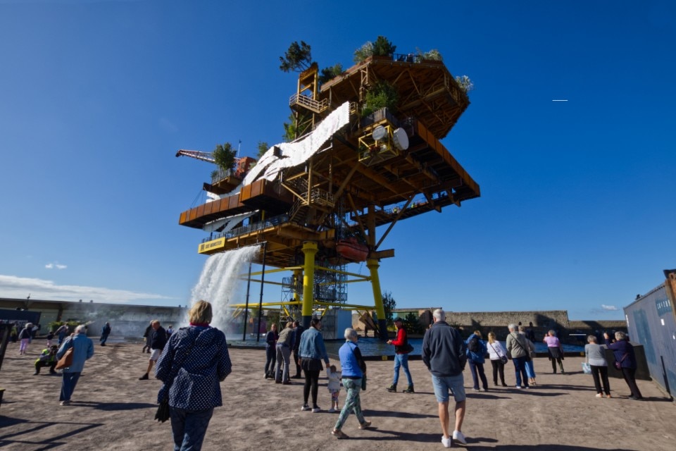 The four-storey, 450-tonne oil rig has been positioned in a shallow pool on the seafront in Weston-super-Mare, Somerset. Its upper floors contain a wild garden composed of plants adapted to the Atlantic climate. The art installation features a multi-level slide, a media studio, and an amphitheatre, while the platform’s former heliport now functions as an observatory and a waterfall cascades 10 meters down from the lowest floor.