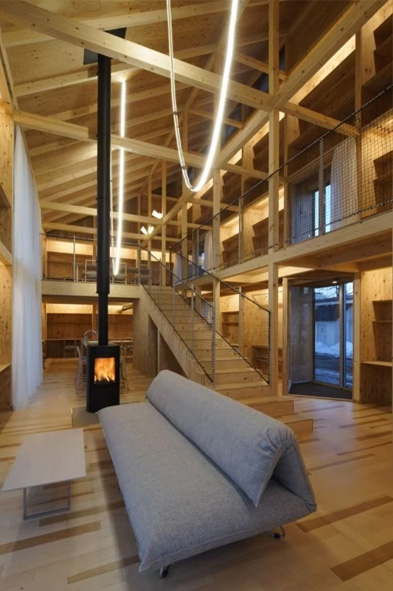 Higashikawa is famous for its production of wooden furniture. Kengo Kuma and Associates therefore collaborated with these factories to shape the workspace: a group of three units made of local wood with sloping roofs. Each volume can accommodate up to 12 people and consists of a kitchen, bathrooms, living area and meeting room. Furthermore, the complex is connected to the nearby municipal library.