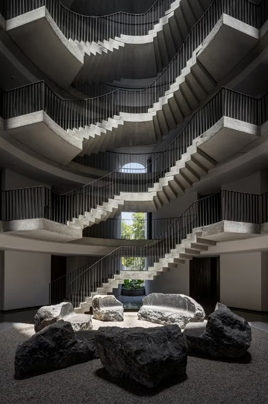 The full-height circular hall at the centre of the building is the main space where access corridors and common areas converge, designed to accommodate a theatrical pause in the movement to and from the residences. Its vertiginous proportions flow in perspective towards the skylight and the composition of stone monoliths lying on the floor instead. The roof garden is divided by means of flowerbeds into private portions and collective areas, shaded with fruit trees.