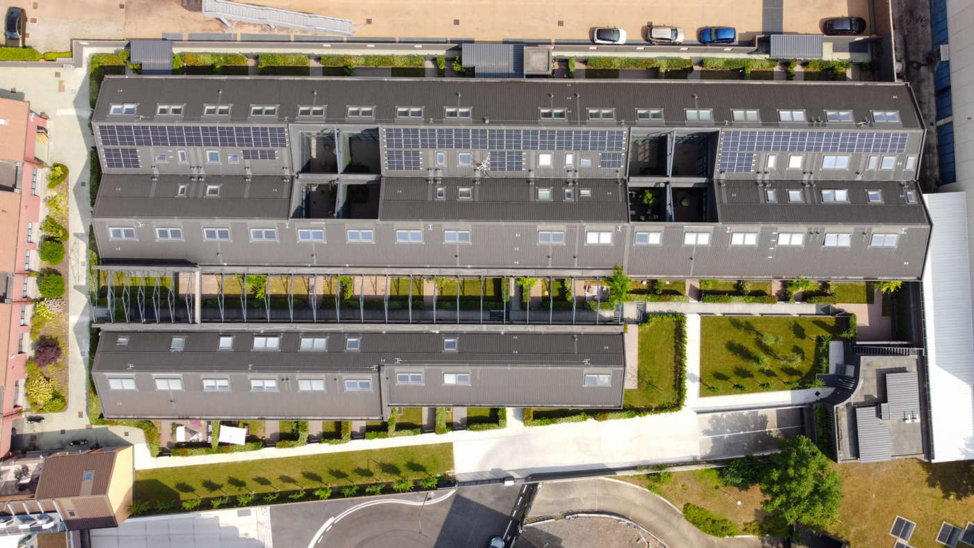 The architecture consists of three blocks with a typical gabled section and an internal steel structure. Three long parallel industrial ships present a body of the building and are incised by patios that allow the space to be recovered for residential use.