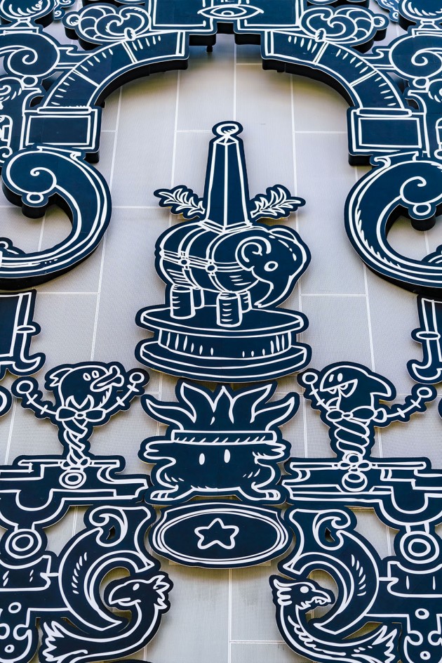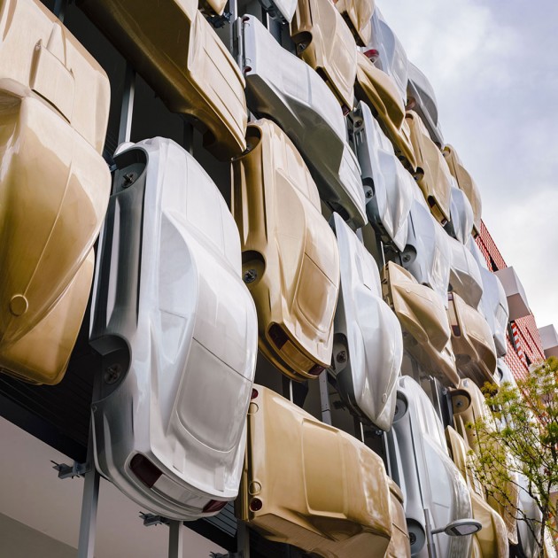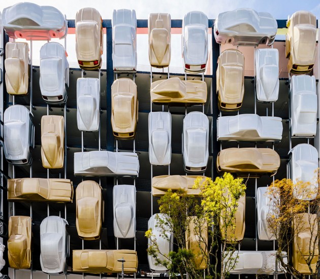 The short upper part of the building was entrusted to the New York studio Work AC, which thickened the façade in order to add a range of small public spaces which climb up to the roofing where an outdoor auditorium is located. Just around the corner, the big globular forms drawn by J. MAYER H. und Partner appear, made of metal mesh and with bright colours. The part in the middle, you go to the car park from, is entrusted to the French artist Nicolas Buffe and it is a stack of 3D printed figures which mix Manga ethics and a tribute to Baroque and to Rococo. The Spanish studio Clavel Arquitectos hangs 45 bodies of vaguely vintage vehicles painted in gold and silver suggesting a vertical traffic jam.