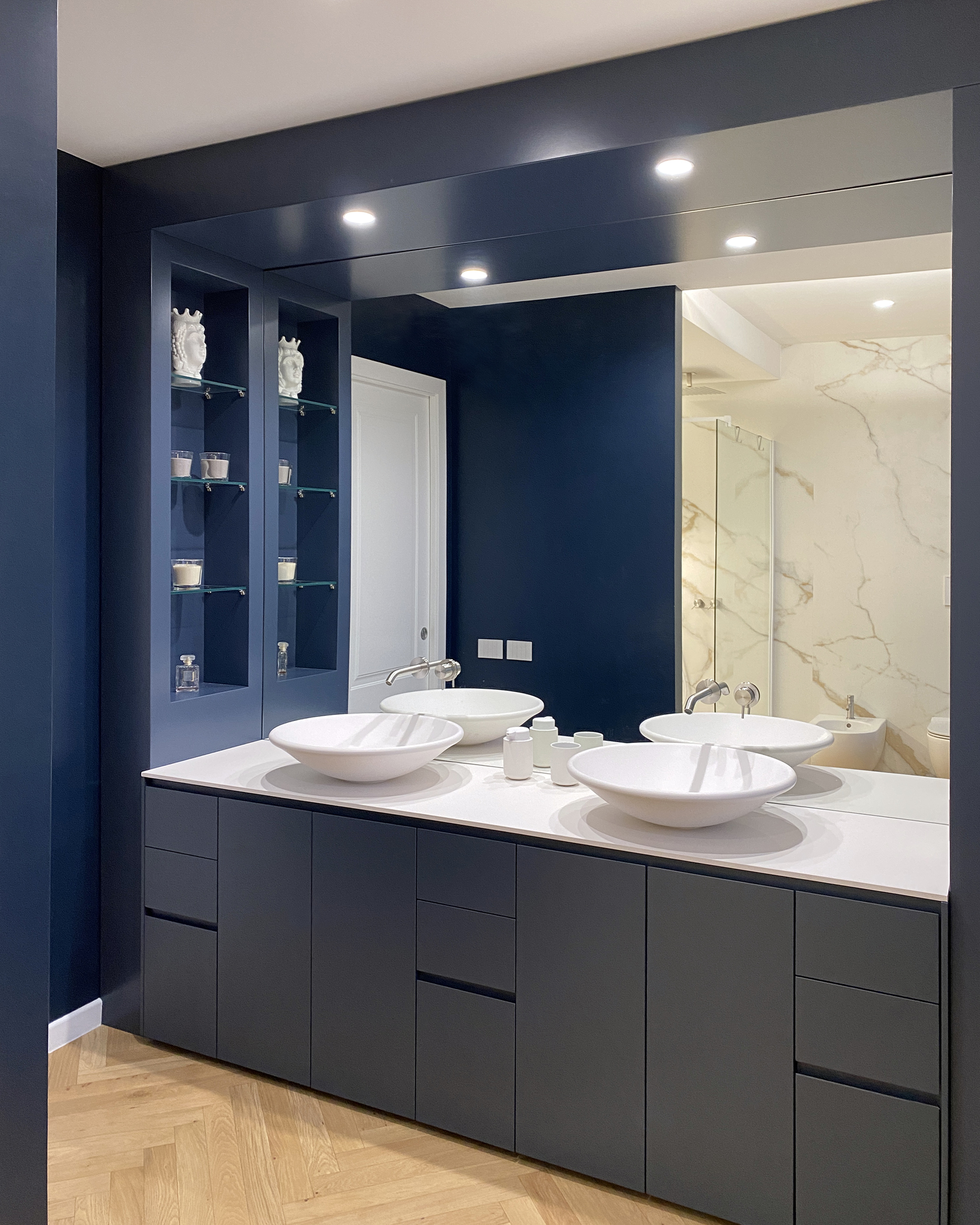 In un’abitazione privata situata in un elegante quartiere di Napoli, lo studio di architettura EF Architect/s ha progettato una sala da bagno molto sofisticata dove domina il colore blu in netto contrasto con il bianco della ceramica e il marmo di Carrara.