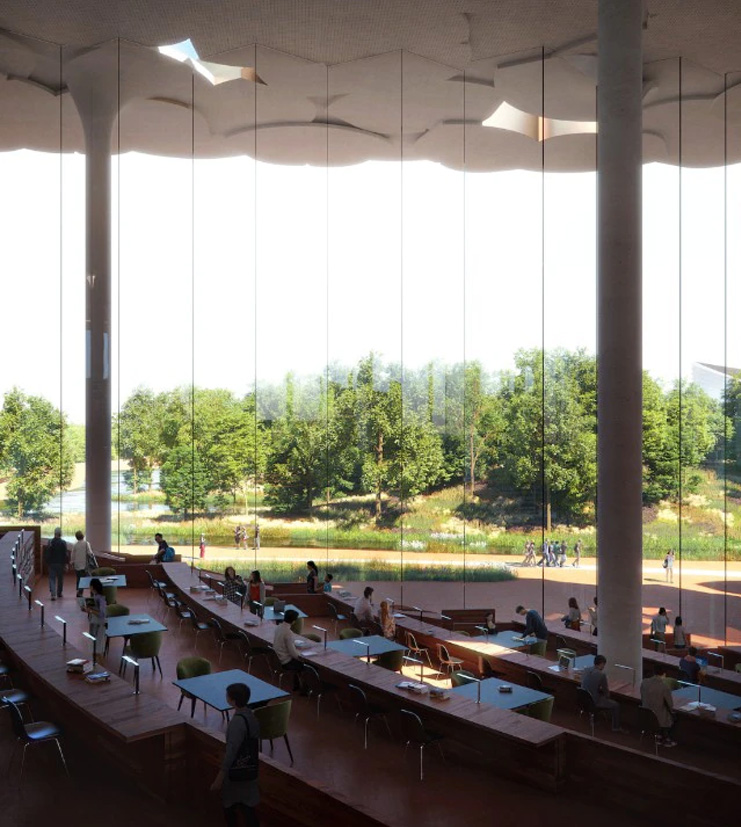 Thanks to its completely transparent façade, the library shows itself outside, highlighting its spaces thanks to the wide passage which connects the northern and the southern sides by means of a valley sculpted by terracing. From this passage some columns stretch out towards the roof: a canopy like a forest of gingko where each element reflects in its shape its technological value as well, in an essential architectonic ecosystem.