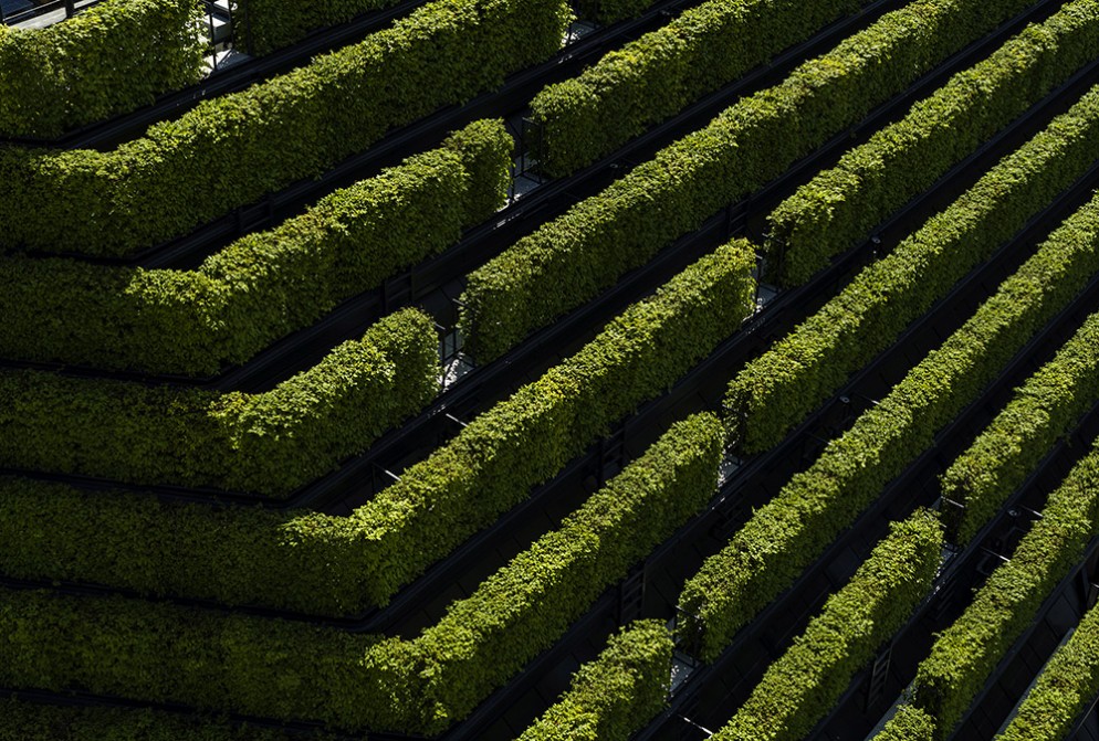 The plants –30,000 altogether for a total linear surface of 8 kilometres – are put into special containers made of steel with integrated irrigation and drainage systems. The designers estimated that the ecological benefits of the perennial hedges (decrease of the temperature immediately perceived around, carbon dioxide absorption) are equal to those of 80 tall trees, underlying that their brave aesthetical choice is not a mere exercise of style.