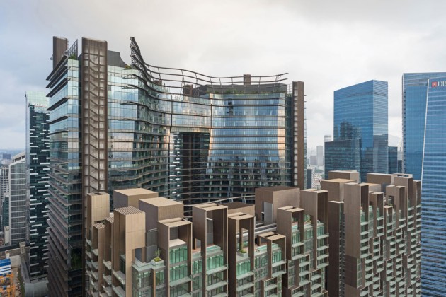 Marina One completes its greenery with an extremely complex facility and it offers a surface dedicated to landscape wider than one fourth, in return. The two L shaped residential blocs are 145-meter-high and include 1042 apartments which overlook water. A bridge at the third floor connects them and holds a spa and an outdoor 50-meter swimming pool, with round windows like a porthole which spread a glimmering light. The towers of offices reach 234 meters and a bridge crosses the distance separating them.