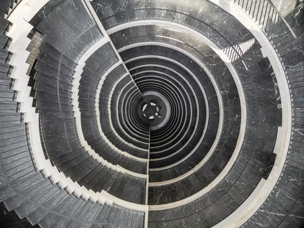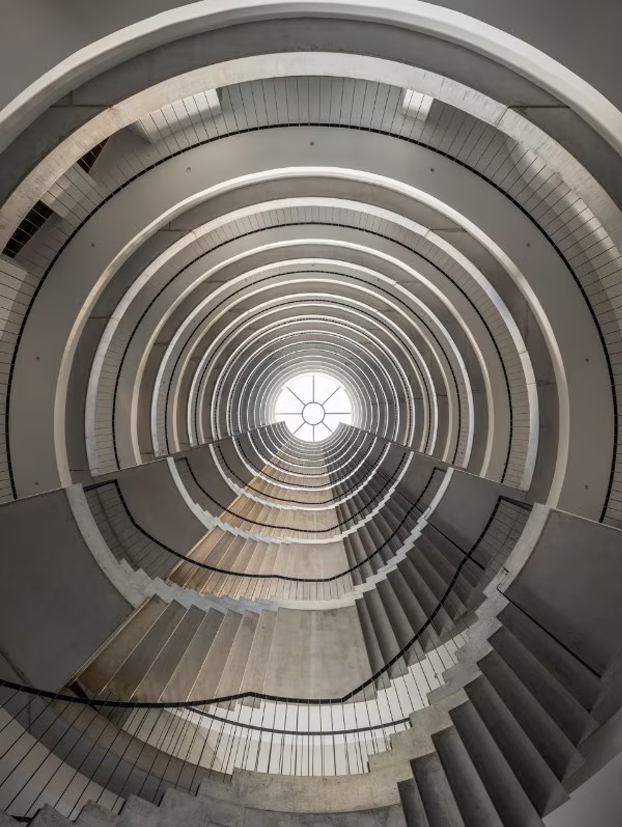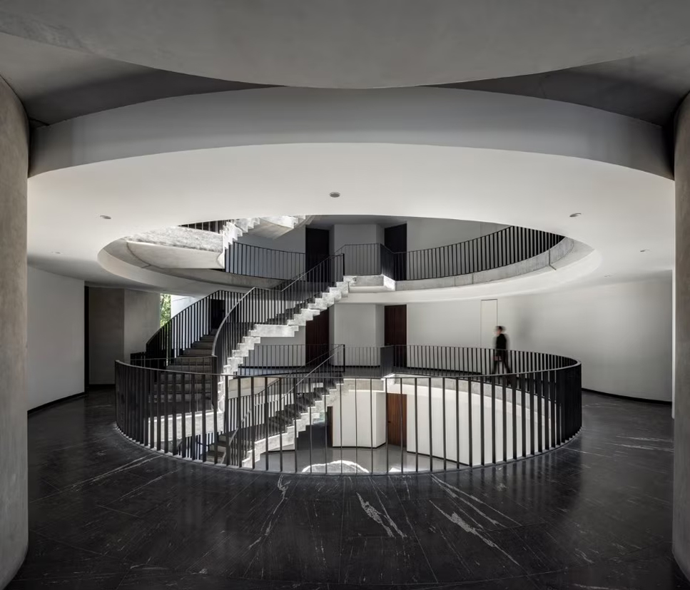 The full-height circular hall at the centre of the building is the main space where access corridors and common areas converge, designed to accommodate a theatrical pause in the movement to and from the residences. Its vertiginous proportions flow in perspective towards the skylight and the composition of stone monoliths lying on the floor instead. The roof garden is divided by means of flowerbeds into private portions and collective areas, shaded with fruit trees.