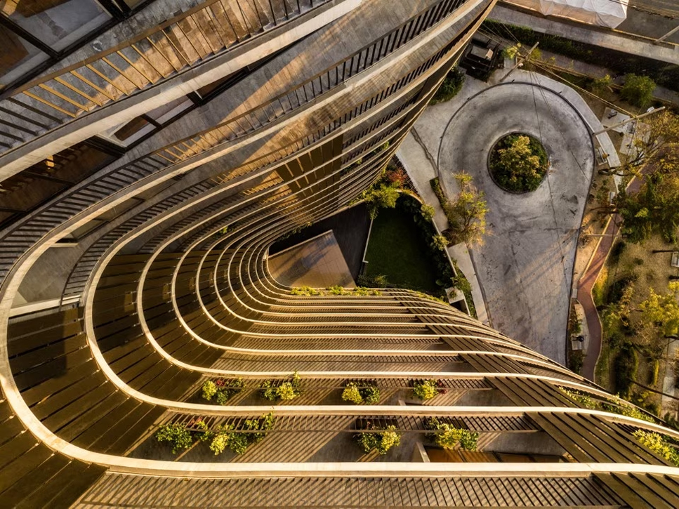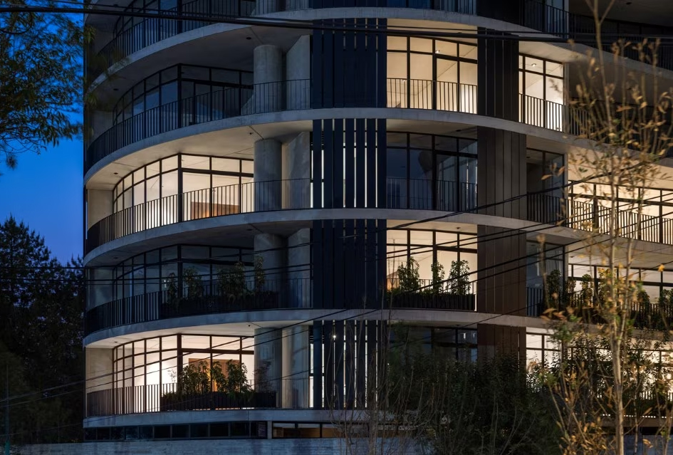 The 112 flats arranged on the 15 floors of the new Pedre building are intended to represent a new idea of urban community. The project was developed by the US studio JSA in collaboration with MTA+V on a lot bordered by two major arterial roads. Rather than morphological or formal continuity, this architecture therefore seeks alternative relationships with the site and the local design culture. On one hand, the refusal of geometric rigidity refers to the local topography and mountain profiles shaped by volcanic eruptions. On the other, the sinuosity of the casing is a reference to certain elements of Alvar Aalto and Oscar Niemeyer’s work.