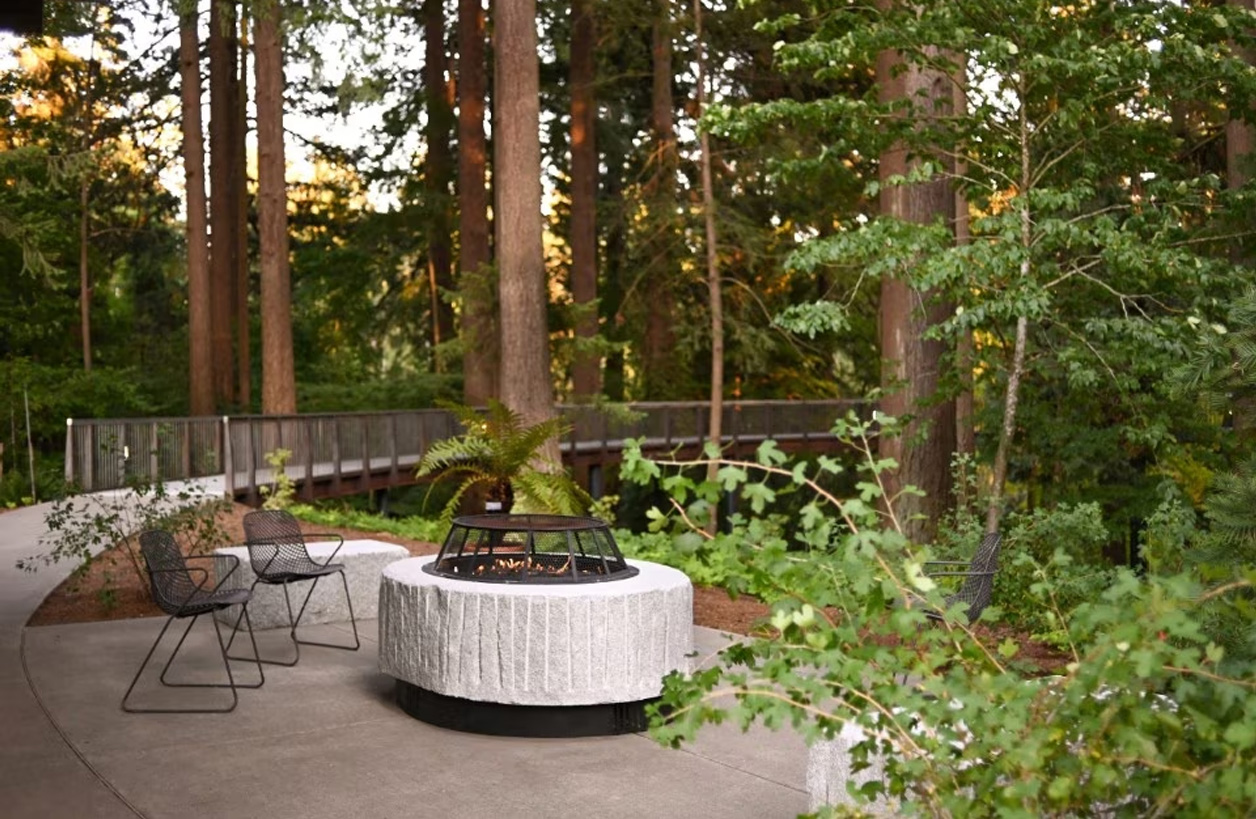 The pavilion, called the Fireside Terrace, is an outdoor, covered structure with slatted wooden walls. The garden actually has a rich history: first used by the natives as a place for hunting, fishing, and camping, in the second half of the 19th century it became part of a sawmill that supplied timber for the construction of houses in Portland.