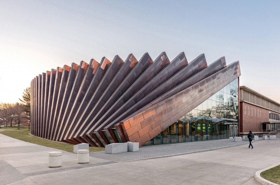 University of Massachusetts Amherst A circular extension made of copper and glass establishes a dialogue with the surrounding commercial buildings