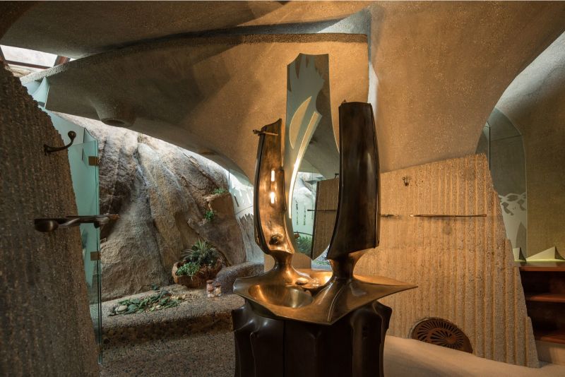 Boulders and parts of the rocky land are integrated into the walls. The master bathroom has a waterfall coming down from the boulders. All these details blend to give a sense of continuity between outside and inside.