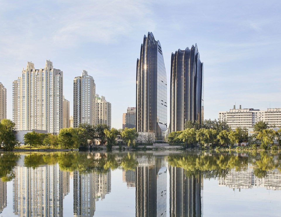 The Chaoyang Park Plaza by MAD Architects in Beijing is characterized by smooth and curved surfaces consisting of white and black elements. It evokes the excitement and the appearance of the traditional Chinese ink painting and it offers a peaceful shelter, protected from the surrounding city chaotic background. This project adds two towers as offices on the northern side of the area which lie on the shore of a small lake with an annexed park; they remind two mountains reflected on the water. The low commercial buildings, on a smaller scale, remind the mountain rocks which are eroded with time. They seem to be positioned randomly, but the mutual relationship is strategical and creates a protected but open urban garden where people can meet and enjoy a little bit of nature in the city. The landscape, which is created among the buildings, includes pines, bamboo trees, rocks and ponds: they are all elements of the eastern landscape which link contemporary architecture and traditions. The project was certified with the LEED Gold Certification of the Green Building Council USA: the vertical small wings placed on the façade made of glass work as a ventilation system and as a filter to improve the energy efficiency helping the cooling of interiors. At the base of the towers the small lake works as a cooling system in Summer time decreasing inside temperatures.