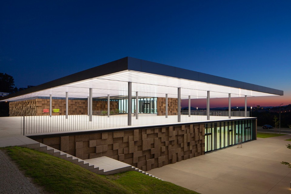With its indoor surface of 3, 200 square meters, the Gymnastic Training Centre at Guimarães, carried out by Pitagoras Group, is located at the east boundary of the city park and was designed for top level gym training. This facility is located between two pre-existing streets which both ensure the access to the building. The sports centre consists of a pavilion, a gym, cubicles, administrative offices and public spaces which permit to have access to several areas. The choice of materials for the building shows an educational purpose. Attention is paid to environment and to energy efficiency pursuing an evident balance between technology and architecture. The façade, made of dark cork, shows the architect’s purposes since it is strongly distinguishing and sustainable at the same time. The building communicates with the references of the surrounding environment and uses its volumetric presence in order to enrich the park paths. It not only creates a square of entrance and links the two levels of the building, but it also allows to contemplate the park and the eastern hill of the city.