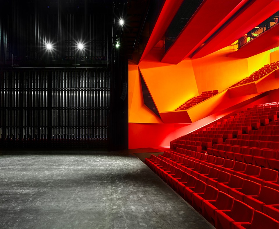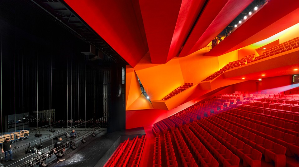 Il teatro realizzato da Dominique Coulon & associés a Freyming-Merlebach, in Francia, instaura un dialogo formale con il paesaggio urbano eterogeneo, e si modella in relazione al contesto e alla logica dei flussi esistenti. La sua forma insolita e le sue dimensioni gli conferiscono un aspetto particolare. Le linee garantiscono una transizione visiva tra le parti diverse del programma, mantenendo le stesse dimensioni del contesto urbano. L’interesse del visitatore è catturato dal dinamismo dei volumi: nella parte superiore il foyer crea un aggetto per indicare l’ingresso, mentre nella parte inferiore, gli elementi trasparenti lasciano intravedere la ricchezza di percorsi interni. Il foyer occupa uno spazio verticale, con un intreccio di scale che portano all’auditorium. Le linee oblique seguono la geometria complessa del sito e fanno si che gli spazi si espandano. L’auditorium contrasta con le superfici neutre dell’involucro esterno. L’edificio presenta una facciata bianca immacolata, mentre il foyer presenta tonalità di beige. L’auditorium da 700 posti è invece caratterizzato dalle tonalità di rosso, rosa arancio. I colori sanciscono l’idea di spettacolo.