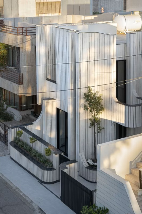 Vista la contiguità con i fabbricati limitrofi e l’assenza di prospettive di qualsiasi interesse verso l’esterno, l’abitazione è concepita come un baluardo introverso che impedisce l’introspezione. Un involucro di muri sinuosi, con poche e mirate aperture, crea schermature e zone protette tra balconi e rientranze, pur consentendo alla luce naturale di penetrare agevolmente. Un piccolo giardino, collocato sul retro anziché sul fronte di accesso come usualmente avviene, favorisce il flusso di ventilazione incrociata e restituisce all’ambiente quella piacevolezza legata al vivere in intimità e sicurezza lo spazio esterno come naturale prosecuzione della vita domestica.