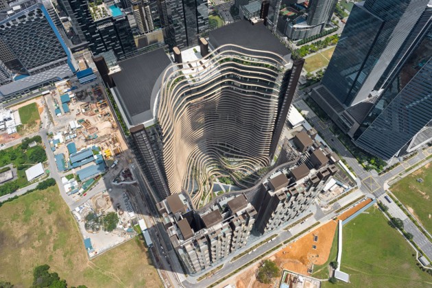 Marina One integra il suo verde in una struttura estremamente complessa e offre in cambio una superficie dedicata al paesaggio maggiore di un quarto. Alti 145 metri, i due blocchi residenziali a L contengono 1042 appartamenti che guardano verso l’acqua. Un ponte al terzo piano li collega tra loro e ospita una spa e una piscina scoperta di 50 metri, con finestre circolari simili a oblò che diffondono una luce baluginante. Le torri di uffici raggiungono i 234 metri e la distanza che le separa è attraversata da un ponte.