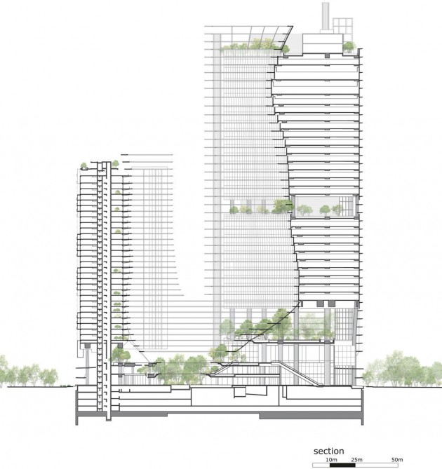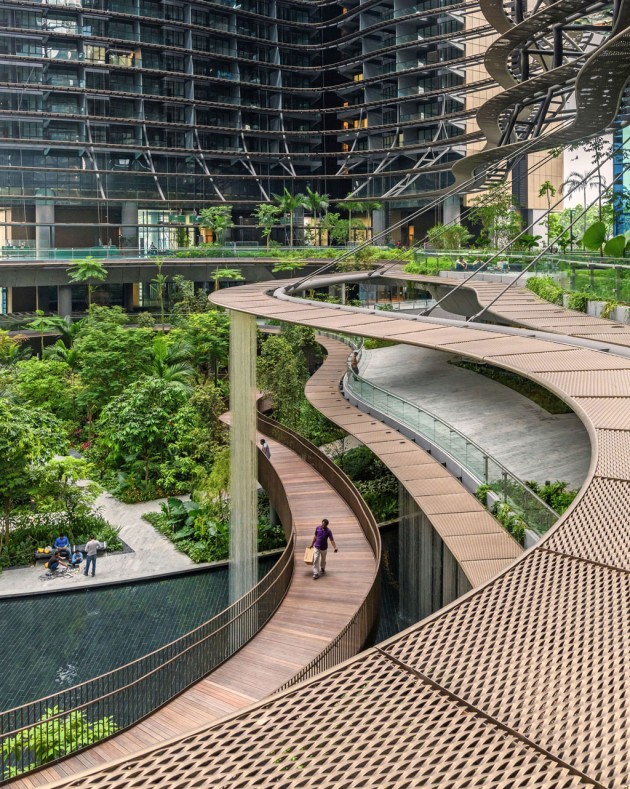 Facebook occupa un intero piano del ponte, il 28°. Gli impiegati entrano nelle torri salendo su scale mobili fino al livello 3 delle lobby, dove si trovano anche opere d’arte in esposizione e un auditorium da 300 posti. Il lato dei blocchi di uffici che si affaccia sul Green Heart assume forme organiche: le facciate sono curve e ondulate e sporgono sensualmente verso l’esterno aumentando la superficie dei piani più alti. Al quarto e al quindicesimo piano due rientranze all’aperto – con soffitto a doppia altezza d’acciaio che sfuma nel bronzo – ospitano gli skygarden. Sul bordo del quarto piano sono situati i ristoranti vetrati cui si accede tramite scale mobili direttamente dal giardino. Ai parcheggi sotterranei e ai 18mila metri quadrati di negozi si arriva grazie a scale mobili che scendono fino alle entrate, simili a caverne. Poiché il sole dell’equatore è zenitale, viene schermato da ben 33 chilometri di nastri che fungono da tende da sole, curvi e fluttuanti tutt’intorno al Green Heart, avvolti più in alto sulle torri come strisce serpeggianti.