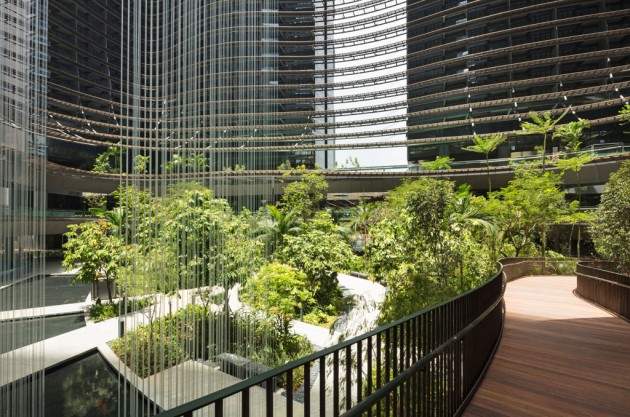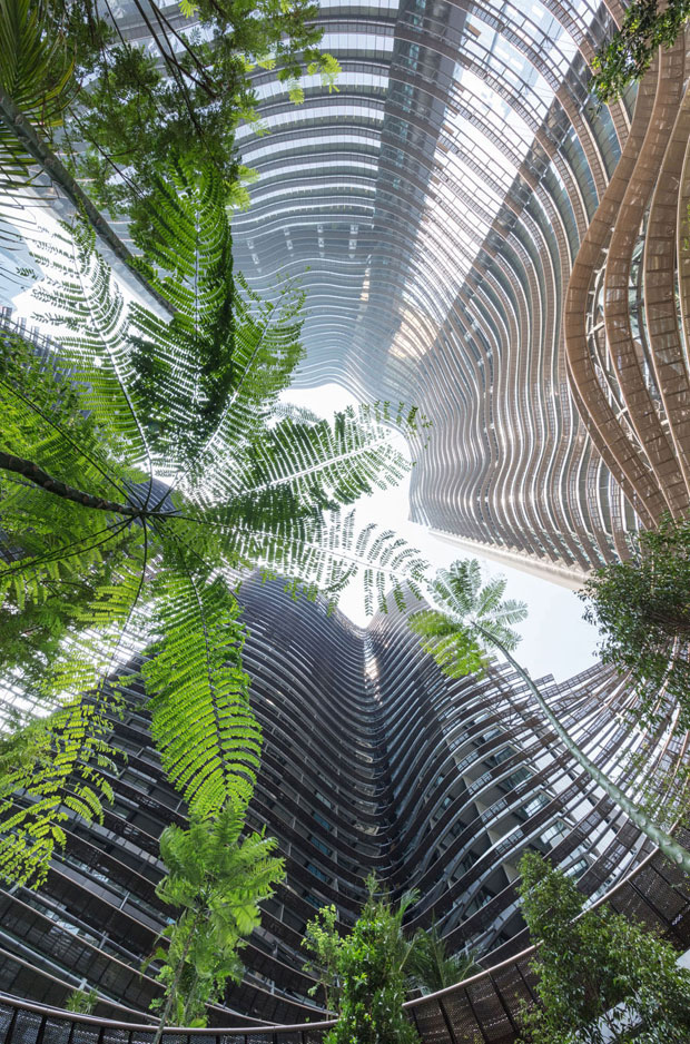 A prima vista, Marina One fa pensare a una fortezza rettangolare, massiccia, scura. In realtà si tratta di quattro torri angolari distinte, simili ai lati di una grande scatola aperta che contiene qualcosa di strabiliante. Al suo interno infatti c’è il Green Heart, il cuore verde di Marina One, un lussureggiante giardino tropicale che dal piano terreno sale fino ai livelli più alti delle torri di 34 piani.