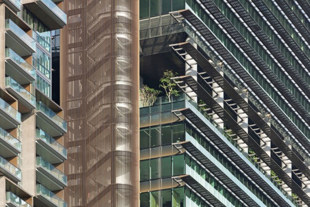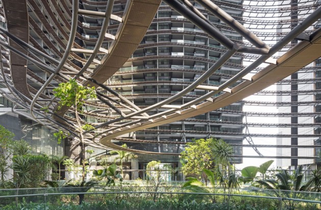 - La forma organica di Marina One, insieme alle passerelle-frangisole e alla presenza delle piante, concorre a un miglioramento del microclima e all’incremento della biodiversità. (Foto HG Esch)