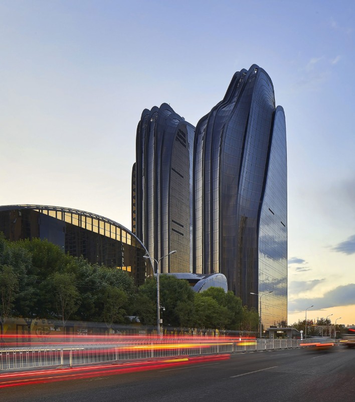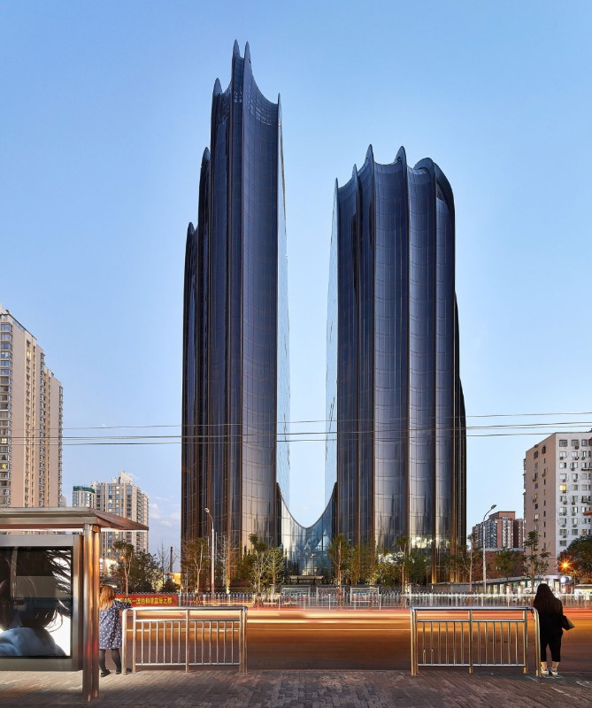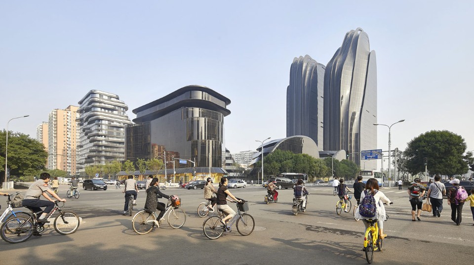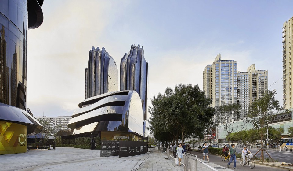 Il Chaoyang Park Plaza di MAD Architects a Pechino è caratterizzato da superfici lisce e curve composte da elementi bianchi e neri. Richiama l’emozione e l’estetica della pittura a inchiostro tradizionale cinese, e offre un rifugio tranquillo, protetto dal contesto caos urbano circostante. Il progetto introduce due torri per uffici sul lato nord dell’area che siedono sulla riva di un laghetto con parco annesso e che ricordano due montagne riflesse sull’acqua. Gli edifici commerciali bassi e a scala più piccola ricordano le rocce montagnose erose dal tempo. Sembrano posizionati casualmente, ma la relazione reciproca è strategica e forma una giardino urbano protetto ma aperto dove le persone possano radunarsi e godere di un po’ di natura in città. Il paesaggio che si viene a formare tra gli edifici comprende pini, bamboo, rocce e stagni: sono tutti elementi del paesaggio orientale che mettono in relazione architettura contemporanea e tradizione. Il progetto ha ricevuto la certificazione LEED Gold Certification del Green Building Council USA: le alette verticali posizionate sulla facciata di vetro fanno da sistema di ventilazione e filtro per migliorare l’efficienza energetica, agevolando il raffrescamento degli interni. Alla base delle torri il laghetto serve come sistema di raffreddamento durante l’estate, riducendo le temperature interne.