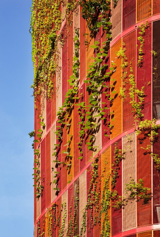 Le piante rampicanti sono usate come fossero una vera e propria materia architettonica. Il volume dell’edificio è scolpito da tre ampi vuoti che funzionano come piani terra in altezza e dedicati ad attività ricreative; un quarto giardino in altezza è situato in cima all’edificio. Questi spazi migliorano efficacemente la ventilazione nell’edificio mentre la rete rossa in combinazione con il verde, costituisce il principale dispositivo di ombreggiatura.