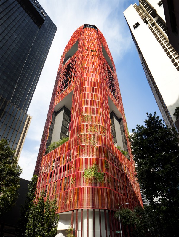 Nel progetto per la torre-hotel Oasia Downtown ideato da WOHA nel Central Business District di Singapore, le facciate sono state pensate come un vero e proprio progetto di paesaggio. La rete metallica rossa che avvolge l’edificio è l’elemento che consente la proliferazione di una rigogliosa vegetazione. L’edificio ha vinto il premio Best Tall Building Worldwide 2018 prize alla sedicesima edizione dell’Annual Council on Tall Buildings and Urban Habitat (CTBUH).