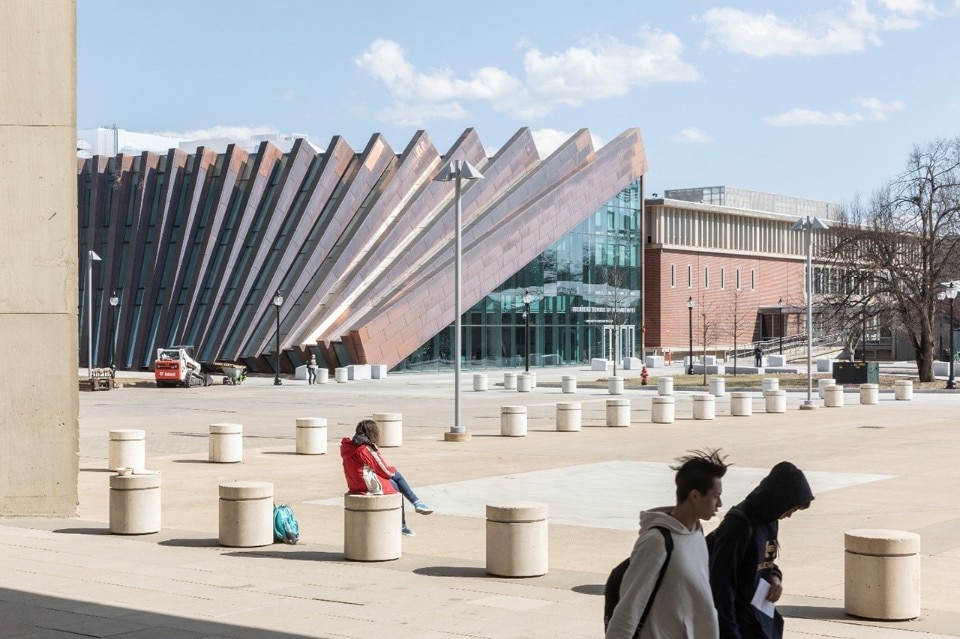 University of Massachussets Amherst Un’estensione circolare di rame e vetro crea un dialogo con gli edifici commerciali intorno