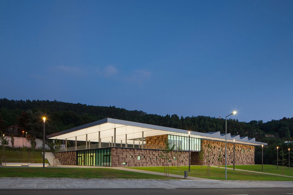 With its indoor surface of 3, 200 square meters, the Gymnastic Training Centre at Guimarães, carried out by Pitagoras Group, is located at the east boundary of the city park and was designed for top level gym training. This facility is located between two pre-existing streets which both ensure the access to the building. The sports centre consists of a pavilion, a gym, cubicles, administrative offices and public spaces which permit to have access to several areas. The choice of materials for the building shows an educational purpose. Attention is paid to environment and to energy efficiency pursuing an evident balance between technology and architecture. The façade, made of dark cork, shows the architect’s purposes since it is strongly distinguishing and sustainable at the same time. The building communicates with the references of the surrounding environment and uses its volumetric presence in order to enrich the park paths. It not only creates a square of entrance and links the two levels of the building, but it also allows to contemplate the park and the eastern hill of the city.