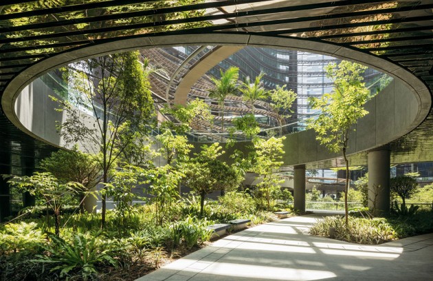 At first sight, Marina One reminds you a rectangular, massive and dark fortress. Actually, they are four angular separated towers like the sides of a big open box which holds something amazing. Inside, in fact, there is the Green Heart, the green heart of Marina One, a luxuriant tropical garden which goes up from the ground floor to the highest levels of 34 floor towers.