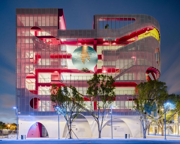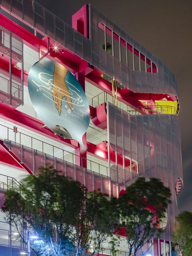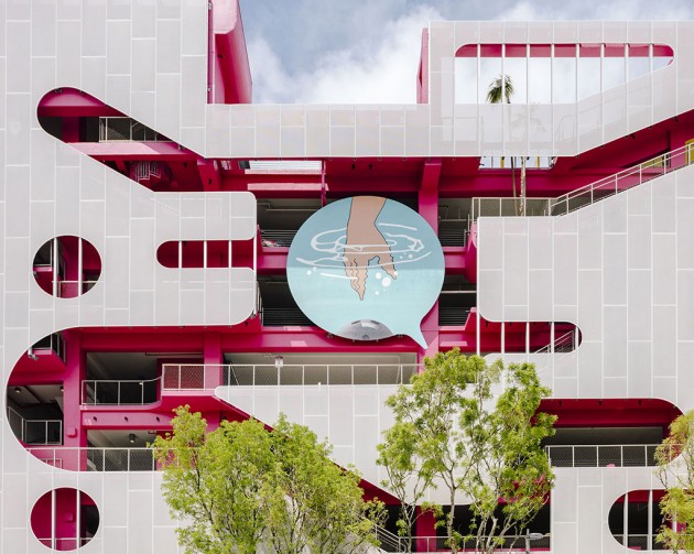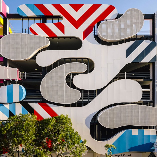 In Miami, like many other USA cities, mobility is mainly based upon cars; therefore, the success of a destination depends on the possibility to park nearby. The designer and curator Terence Riley pursued a generous as well as smart idea: he subdivided the façade into five parts, giving to as many authors (including his studio) the task to create a section of it.