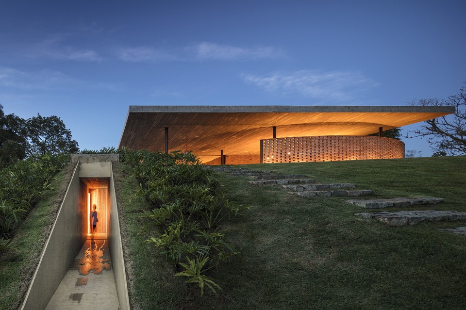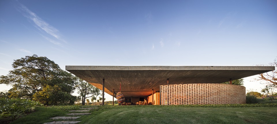 Marcio Kogan’s studio is not an outsider as for the fundamental experiments on horizontality and this private residence at Porto Feliz, in San Paolo region, is not an exception. However, Casa Plana shows an uncommon element for this studio practice: a bendy curve, that is a wall of perforated bricks which moves freely in front of the east view.