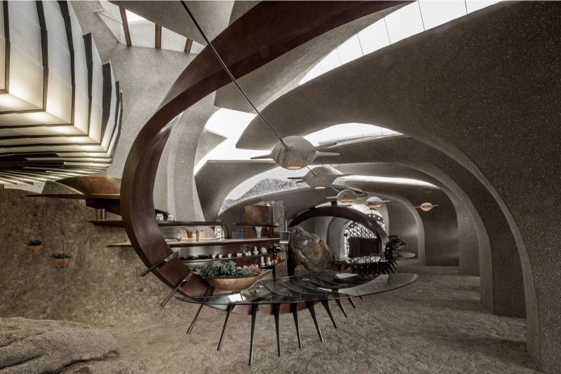 In questo progetto di architettura moderna non ci sono finestre tradizionali, la luce filtra all’interno di questo edificio di arte moderna attraverso gli spazi vuoti nel tetto.