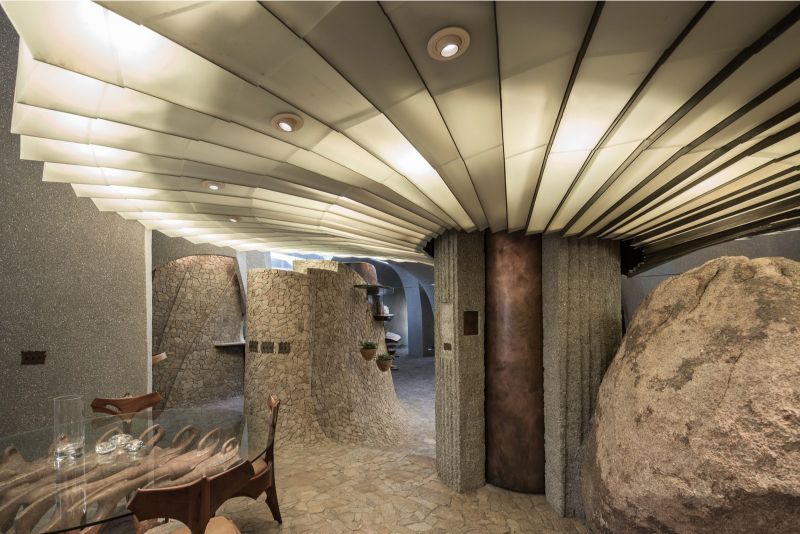 Massi e parti della terra rocciosa sono integrati nelle pareti. Il bagno padronale ha una cascata che scende dai massi. Tutti questi dettagli si fondono per creare un senso di continuità tra esterno ed interno.