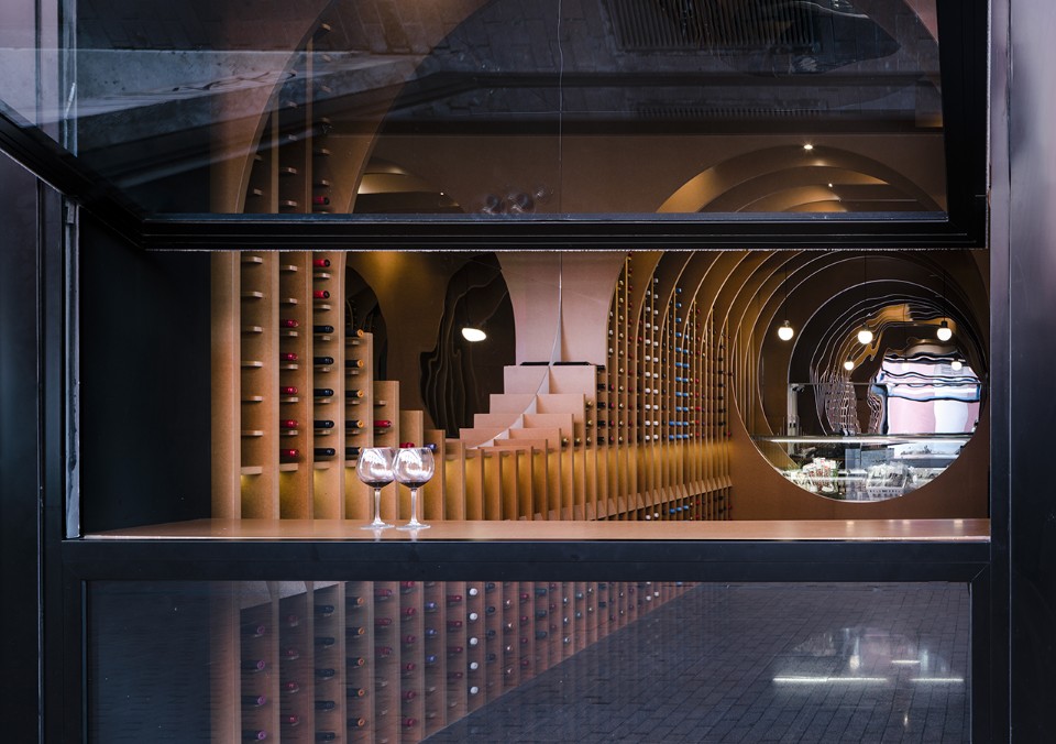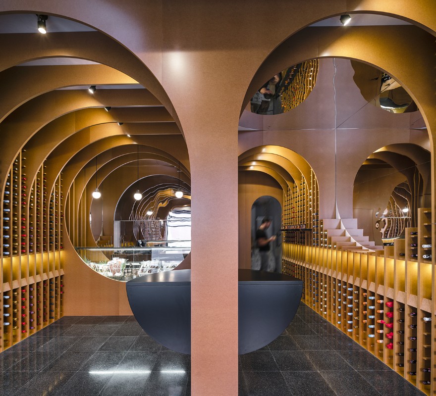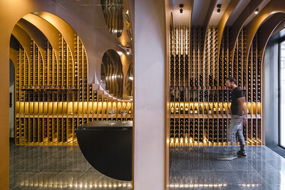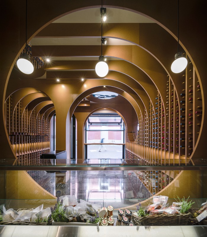 Il progetto di Zooco per questa enoteca a Valladolid, in Spagna, parte dalla giustapposizione di diverse circonferenze in direzione longitudinale e trasversale, che creano uno spazio in cui le varie funzioni – bancone, tavoli e spazio espositivo – appaiono attraversando lo spazio. Questa serie di curve genera archi che visti linearmente sono visti come delle volte. Il sistema rievoca le antiche cantine a volta. Una volta pensato il sistema, Zooco Estudio ha diviso le partizioni con ripiani di 15 cm, ottenendo in questo modo degli espositori per i vini. Lo spazio è percepito come una serie di nervature di legno caratterizzate da forme curve. Per il progetto sono stati utilizzati tre tipi di materiali diversi: il legno per il sistema di nervature, la pietra per la pavimentazione e degli specchi per dare ampiezza agli ambienti.