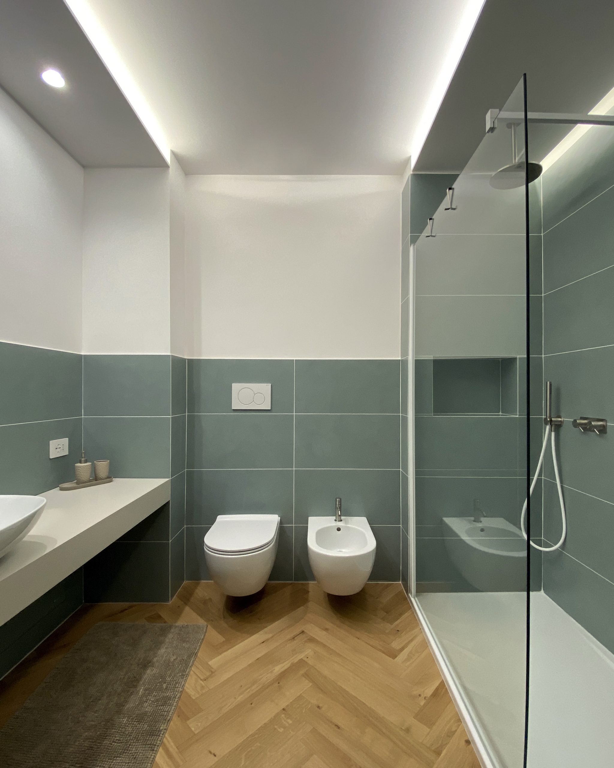 Per il lavabo il miscelatore monocomando da parete; per il bidet il miscelatore da appoggio e per la doccia il soffione da parete da 220 mm di diametro completo di doccetta stilo e di deviatore a due vie.